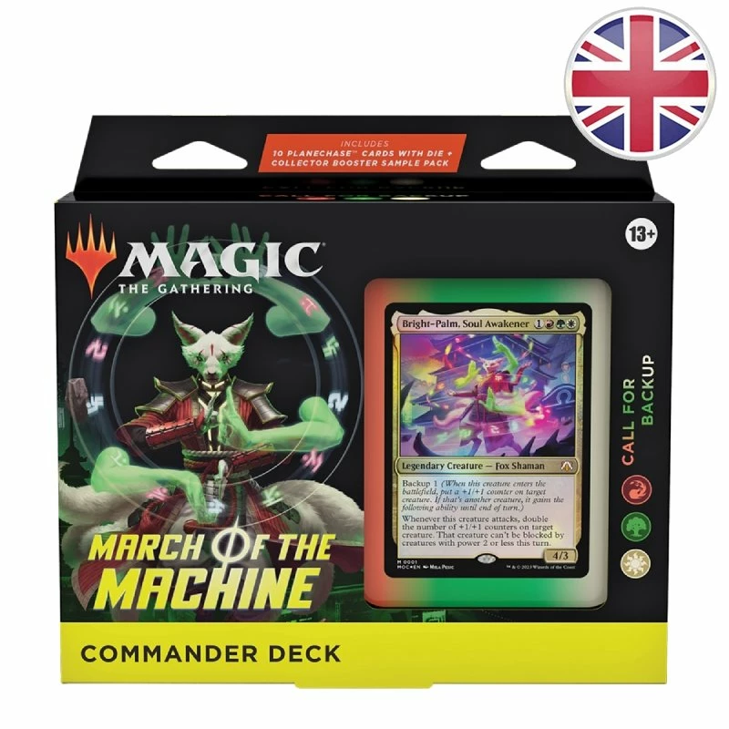 Call for Backup est un deck Rouge / Vert / Blanc dont la stratégie repose sur les marqueurs +1/+1. Sa commandante Bright-Palm, Soul Awakener possède elle-même la nouvelle mécanique Main Forte et peut donc partager sa capacité qui double les marqueurs +1/+1 présents sur elle lorsqu’elle attaque, en plus de devenir imblocable ce tour par les créatures ayant une force de 2 ou moins.